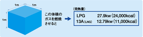 プロパンガス(LPG)の発熱量は1m3で27.9kw(24,000kcal)です。