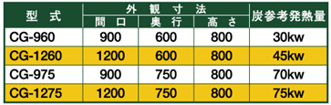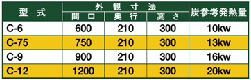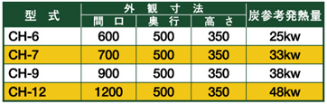 (8.1〜9.3kw)※使用する炭の種類や品質によって、かなり違いがあります。(木炭・備長炭等)実際に入れる炭の量や、熾り具合で発熱量は変化しますのでご注意下さい。