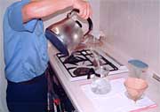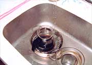 4.出来上がったコーヒーをボールやナベ等に水を張り、蛇口より少量の水を流しながら、なるべく早くコーヒーを冷やして下さい。(写真6)
