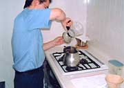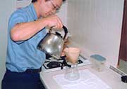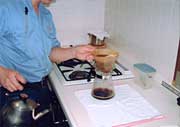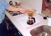 2.沸騰したお湯をやかんからサーバーへと2回繰り返して下さい。85度位のやや低めの温度にします。(写真1、2)