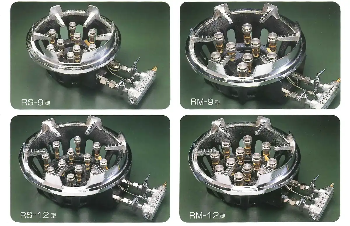 - バーナーヘッド部(炎口部分)は耐熱耐酸に優れている SUS 304 ステンレス鋼を使用したものと、従来品(鉄製クロームメッキ)の 2 種類があります。