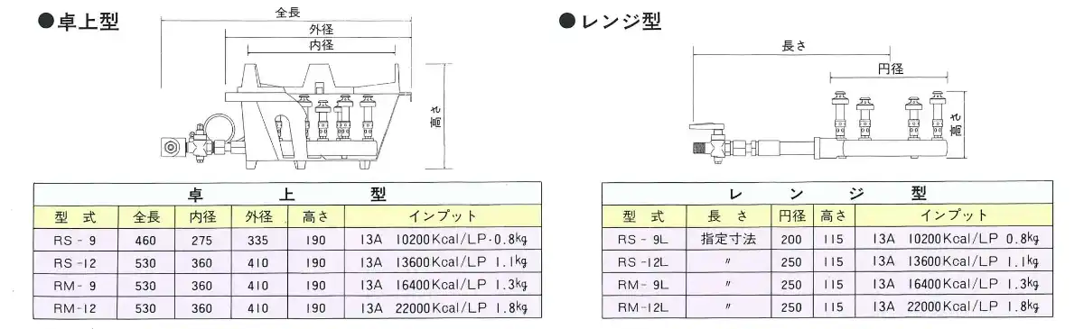 | RS-9L | 指定寸法 | 200 | 115 | 13A:10200Kcal / LP:0.8kg |