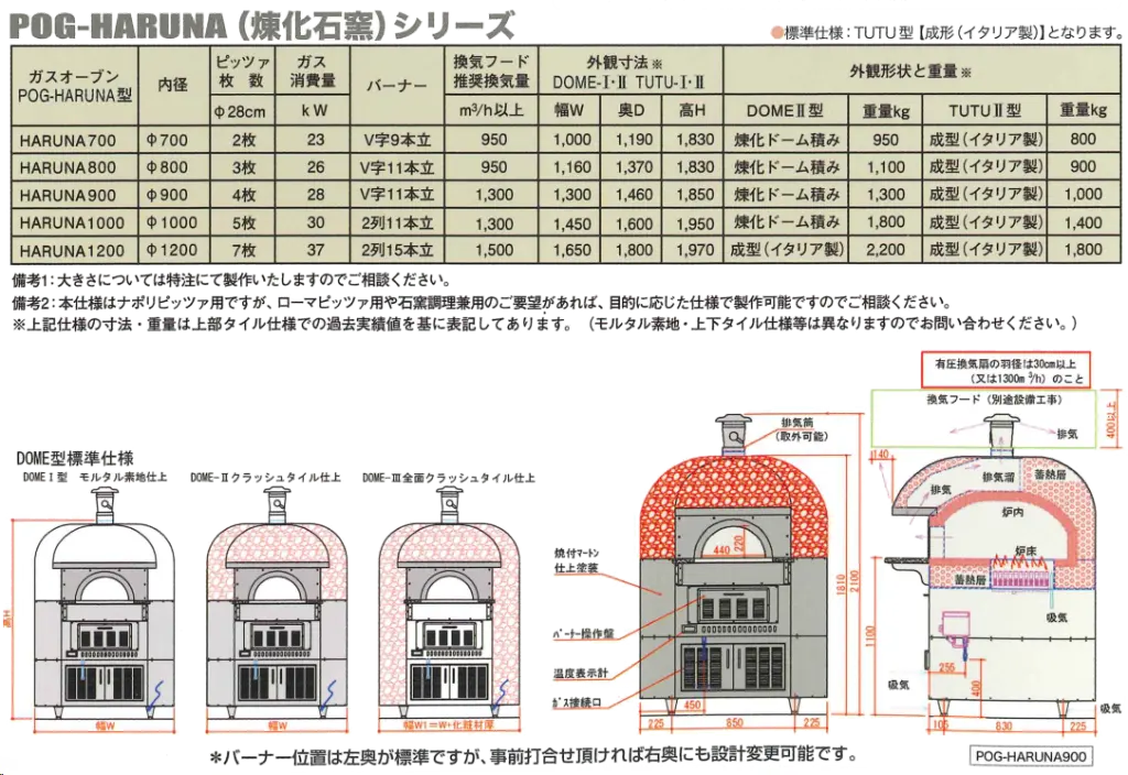 「POG-HARUNA」は、白土煉瓦のドーム構造とガスバーナーの利便性を融合した、次世代型の煉化石ピッツァ窯です。日本の職人技で形成された分厚い蓄熱層が安定した焼成を支え、V型ブンゼンバーナーによる最適な熱分布で、炉壁と炉床の温度バランスを高精度に保ちます。従来品に比べて排気効率が高く、温度管理のしやすさと熱効率の良さを両立した、扱いやすさ重視の高性能モデルです。